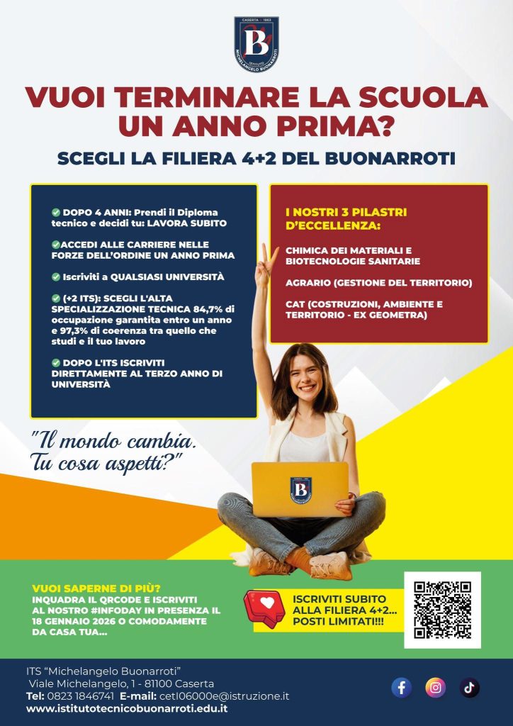 A partire dall’anno scolastico 2026/2027, l’offerta formativa del Buonarroti si arricchirà ulteriormente con altri due percorsi di filiera 4+2, anch’essi unici in tutta la provincia di Caserta:
