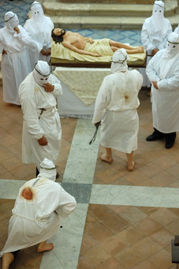 Uomini, donne e bambini, avvolti in un semplice camice bianco, simbolo di purificazione, con il volto coperto da un cappuccio forato all’altezza degli occhi, percorrono a piedi scalzi le strade del paese con passo lento e cadenzato, accompagnando il corteo del Cristo Morto e della Madonna Addolorata. A fare da cornice, i canti del coro e del popolo, che rendono ancora più intensa e toccante la partecipazione collettiva al mistero della Passione.