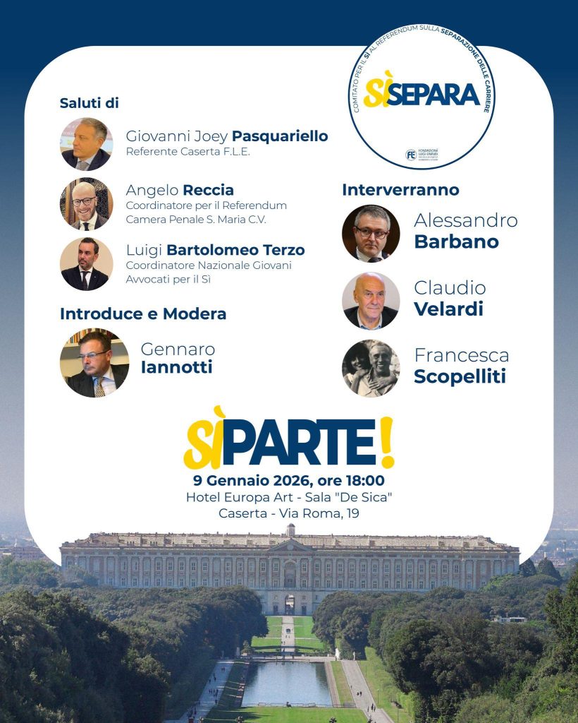 E’ partito venerdì 9 gennaio alle 18.00, presso la sala “De Sica” dell’Hotel Europa Art di Via Roma a Caserta, il ciclo di incontri pubblici in Terra di Lavoro del Comitato per il Sì al Referendum costituzionale sulla separazione delle carriere della magistratura, SìSepara, promosso dalla Fondazione Luigi Einaudi.